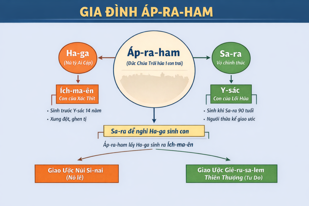 Để hiểu rõ phép ẩn dụ trong Ga-la-ti 4, cần quay lại các sự kiện lịch sử trong sách Sáng Thế Ký mà Phao-lô đang nhắc đến. Nếu hình dung theo cách minh họa, có thể xem câu chuyện này giống như một sơ đồ mối quan hệ, nơi các nhân vật và sự kiện được đặt song song để làm nổi bật sự tương phản mà Phao-lô muốn nhấn mạnh.